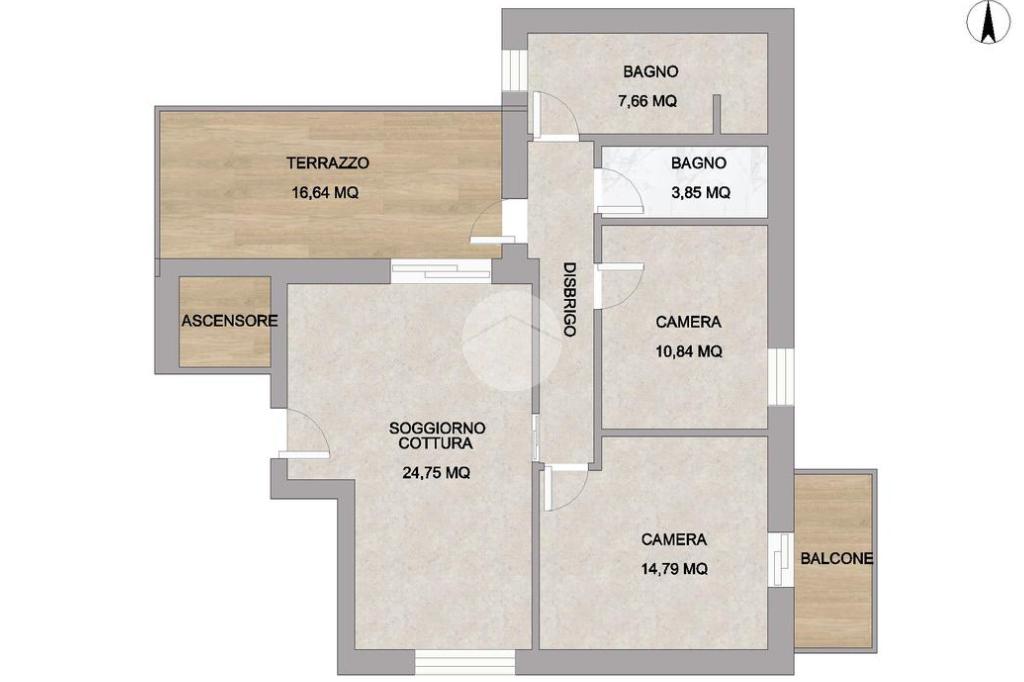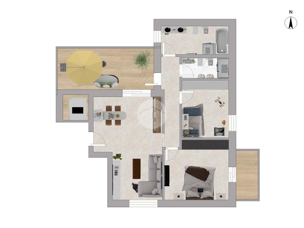 Soggiorno con angolo cottura – due camere da letto – due bagni – terrazzo – balcone – cantina – posto auto coperto.
