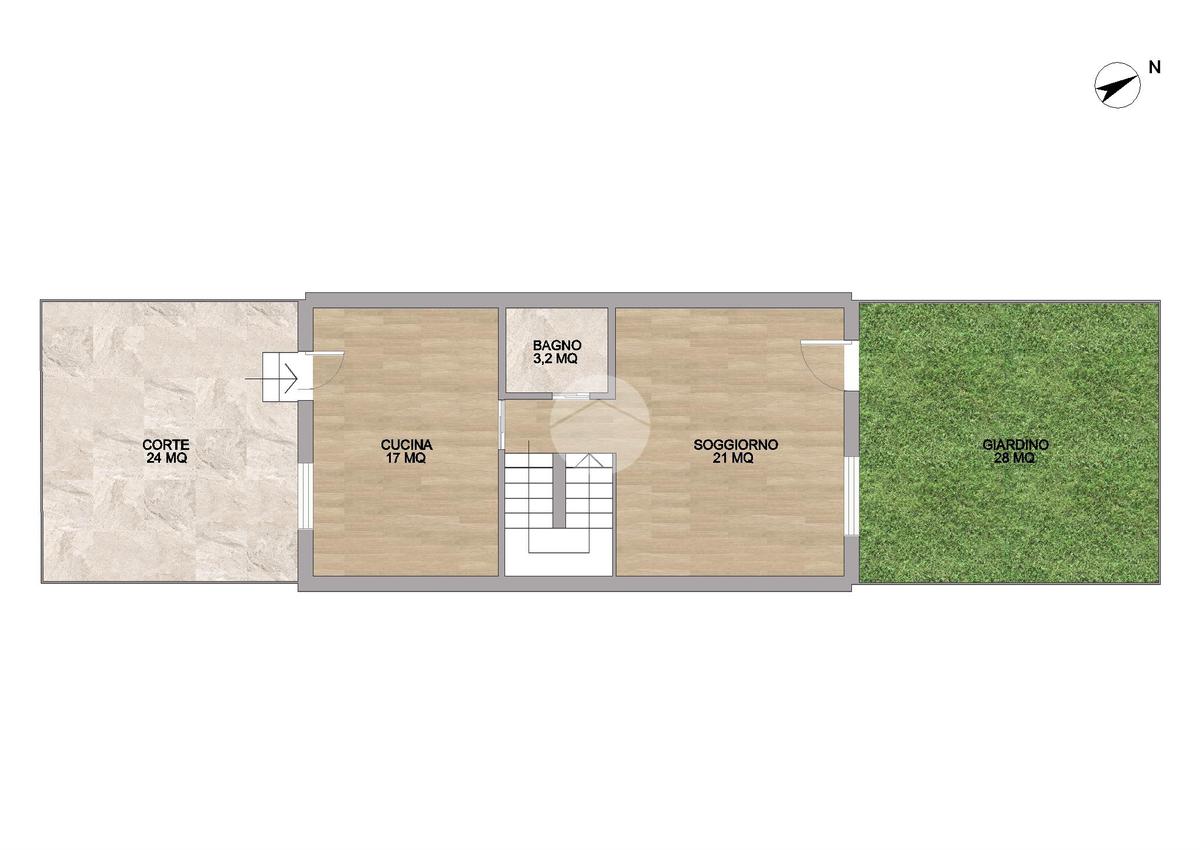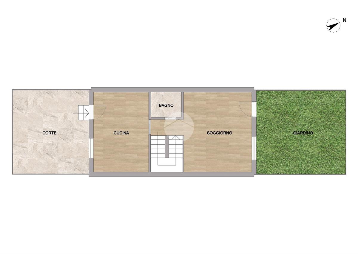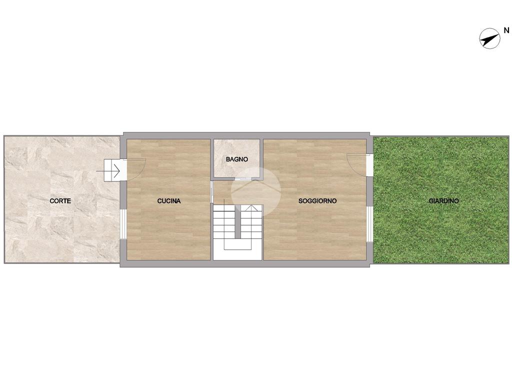 L’ingresso si apre su una corte verde molto ampia che conduce al giardino di pertinenza frontale e all’abitazione. Al piano terra si trova un luminoso soggiorno, una cucina abitabile con accesso diretto a una seconda corte privata sul retro — ideale per pranzi e momenti di relax all’aperto — e un bagno recentemente ristrutturato.