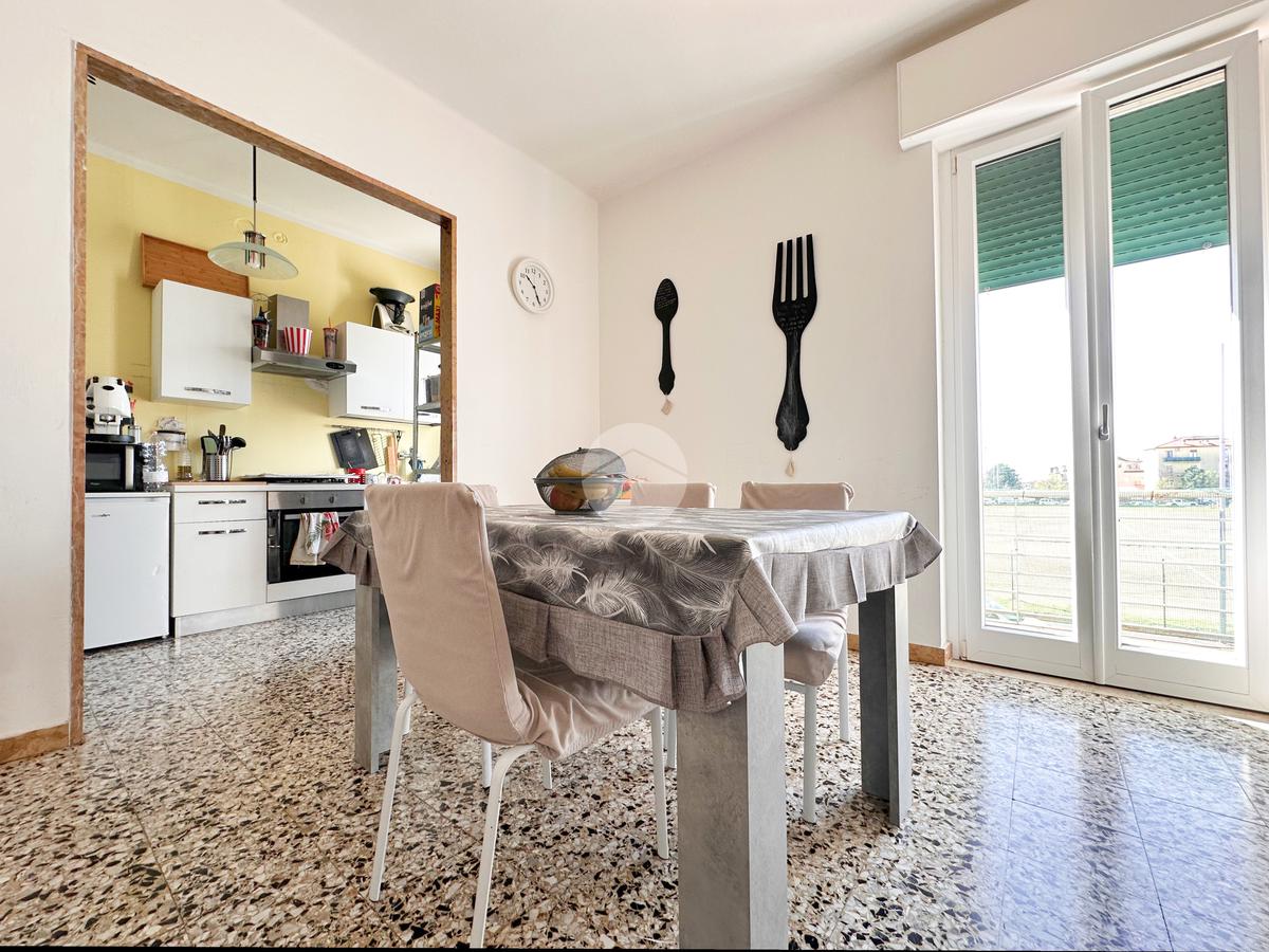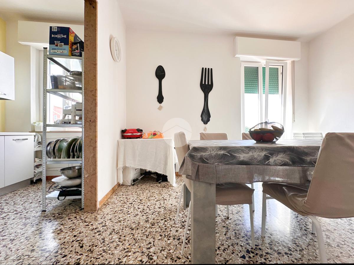 L’abitazione si apre su un corridoio che conduce a una spaziosa cucina abitabile con angolo cottura e accesso diretto al balcone.
